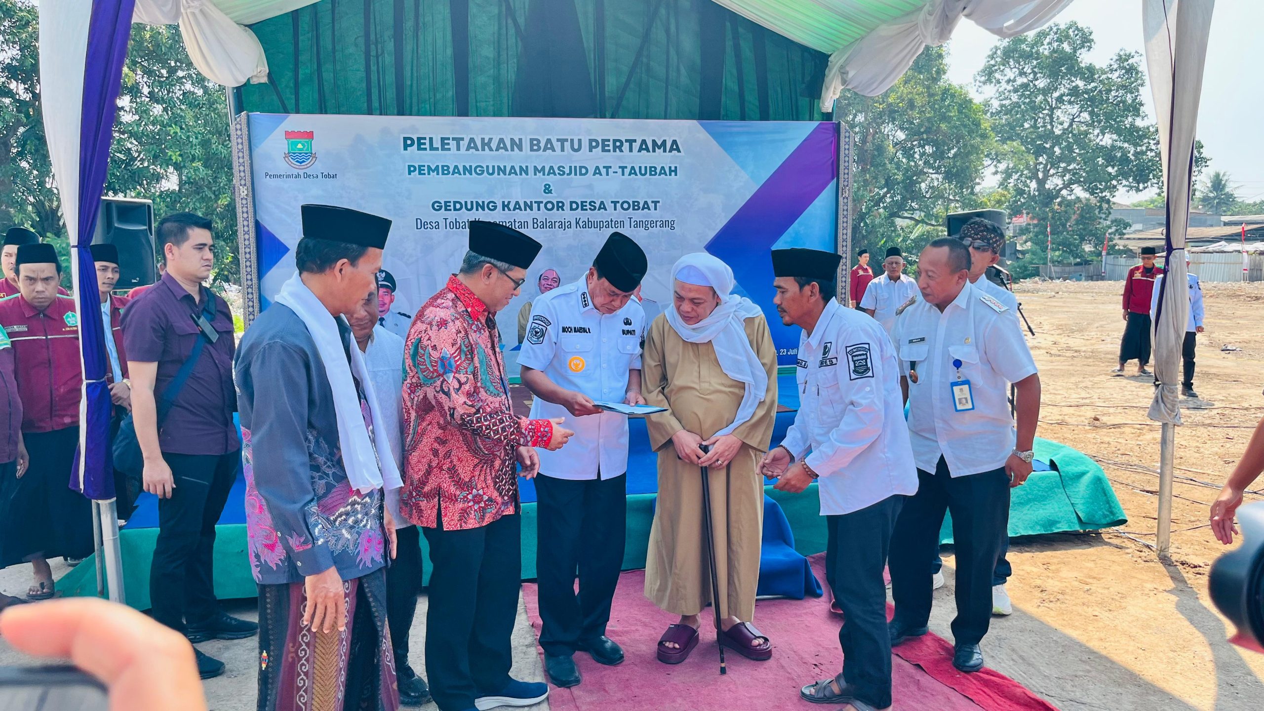 Peletakan batu pertama pembangunan Mesjid Agung Attaubah yang dihadiri Bupati Tangerang Maesyal Rasyid dan ulama kharismatik Abuya Tohlawi Romli atau Abah Entoh (23/7/2025)- (dok. Pemdes Tobat).