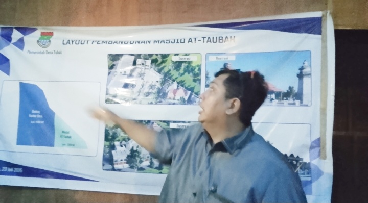 Salah seorang kuasa hukum Pemdes Tobat, Joni Wijaya Sinaga, SH, CLA, CTAP, CTL, CLI, C.Me, CCD, saat menjelaskan layout pembangunan Mesjid Attaubah, Kamis (16/10/2025).